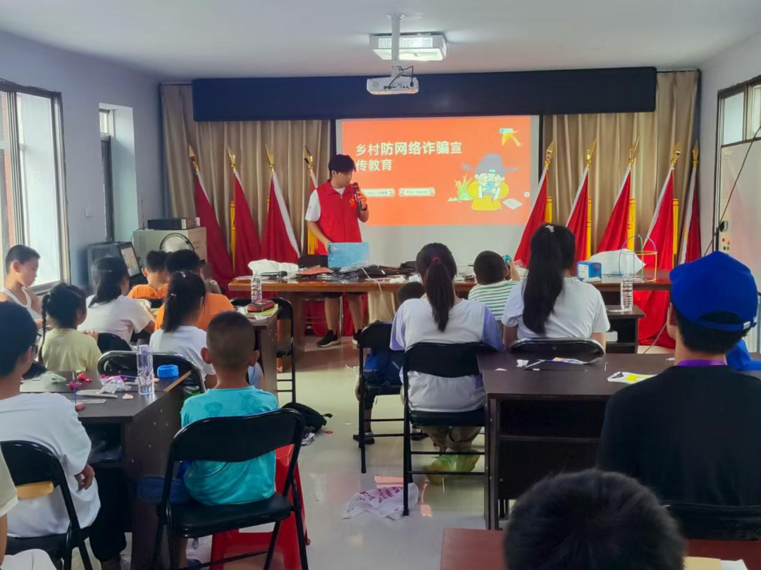 儿童是乡村的未来。实践团首先通过村党支部杨书记的支持和帮助,在村委会活动室举办了一场乡村在智能化时代的网络安全宣传教育活动。随着科技的进步,一些网络诈骗等现象时有发生,在农村的老人、儿童同样是需要重点关注的对象。实践团在宣讲中着重向老人和儿童介绍如何安全使用网络及智能手机。团员们使用趣味视频、趣味游戏等互动方式为孩子们增添妙趣横生的科普体验。“AI绘画”工作坊里,天马行空的想象力通过指尖跃然“屏”上。“老师,我画的小山村已飞上太空了!”留守儿童小宇兴奋地向实践团成员展示他的作品。