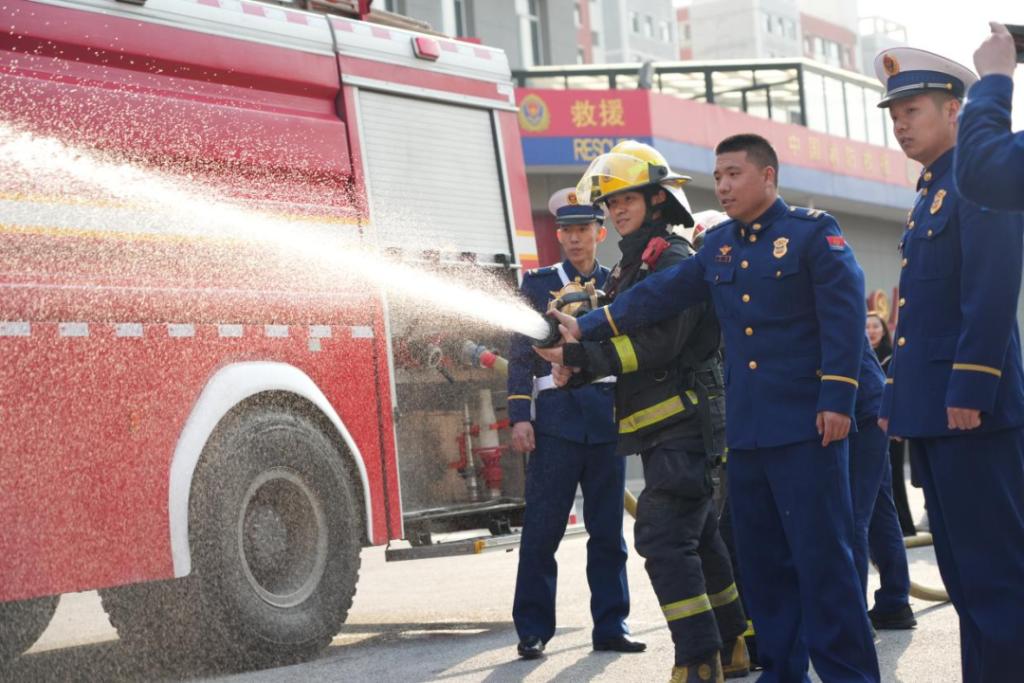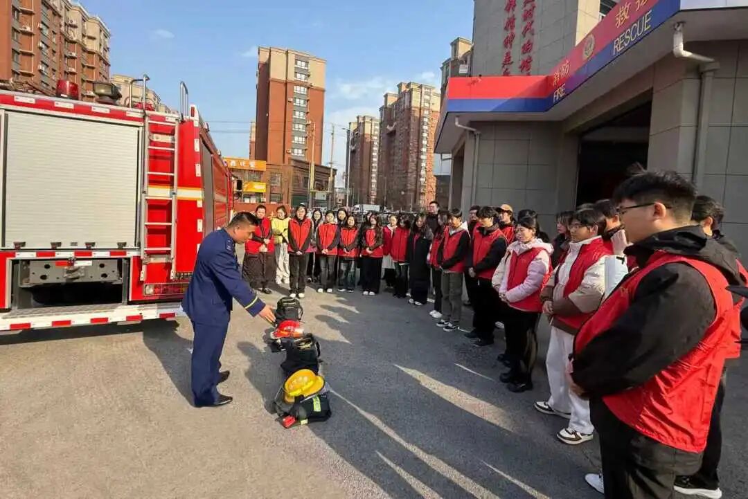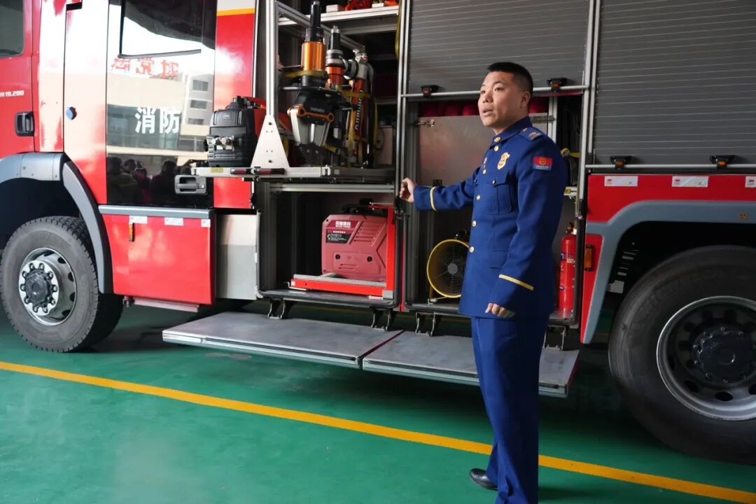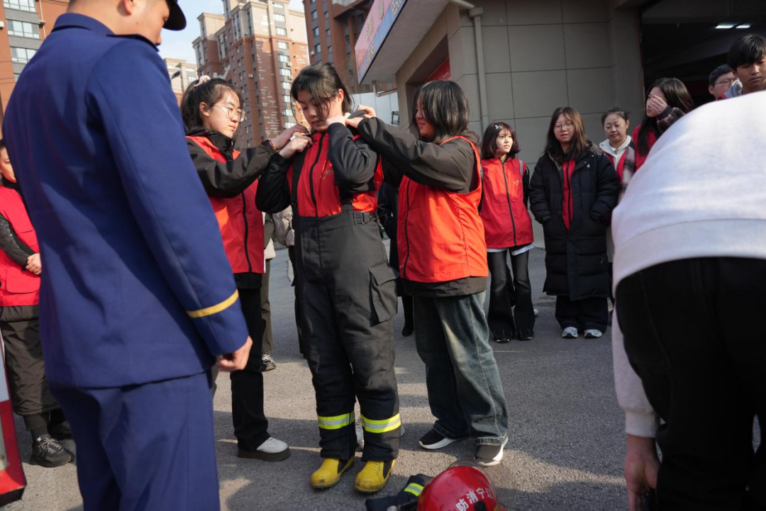 志愿服务结束后,同学们在雷锋消防救援站灭火救援一班班长陈硕的带领下走进雷锋消防站开展参观学习。陈硕班长带领同学们近距离观摩破拆工具、云梯车等专业消防装备,并亲身体验穿戴灭火防护服、操作水带模拟灭火,切身感受消防员日常训练的艰辛与专业。