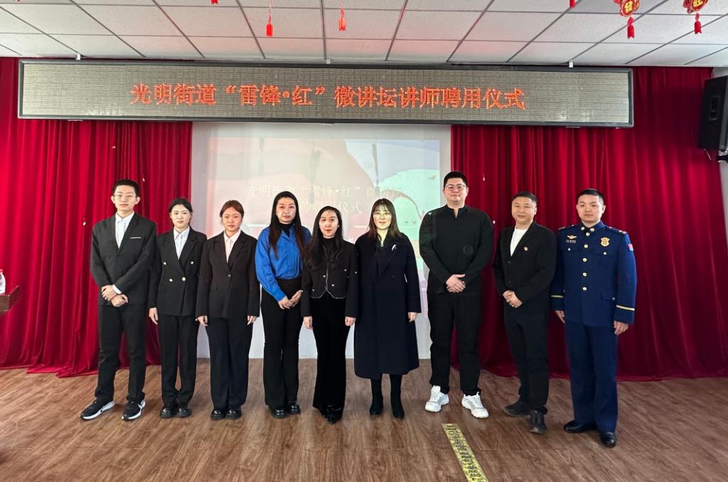 我校始终秉持服务地方发展的使命担当,充分发挥高校人才与理论优势,深度参与区域公益课堂建设。会上,大学生理论宣讲团指导教师张瀚中受聘为“望青锋”公益课堂特聘导师及光明街道“雷锋·红”讲坛讲师,大学生理论宣讲团受聘为光明街道“雷锋·红”合作宣讲团。此次聘任既是对我校师资力量和青年宣讲队伍的高度认可,也为校地联动推动理论宣讲走深走实奠定了坚实基础。