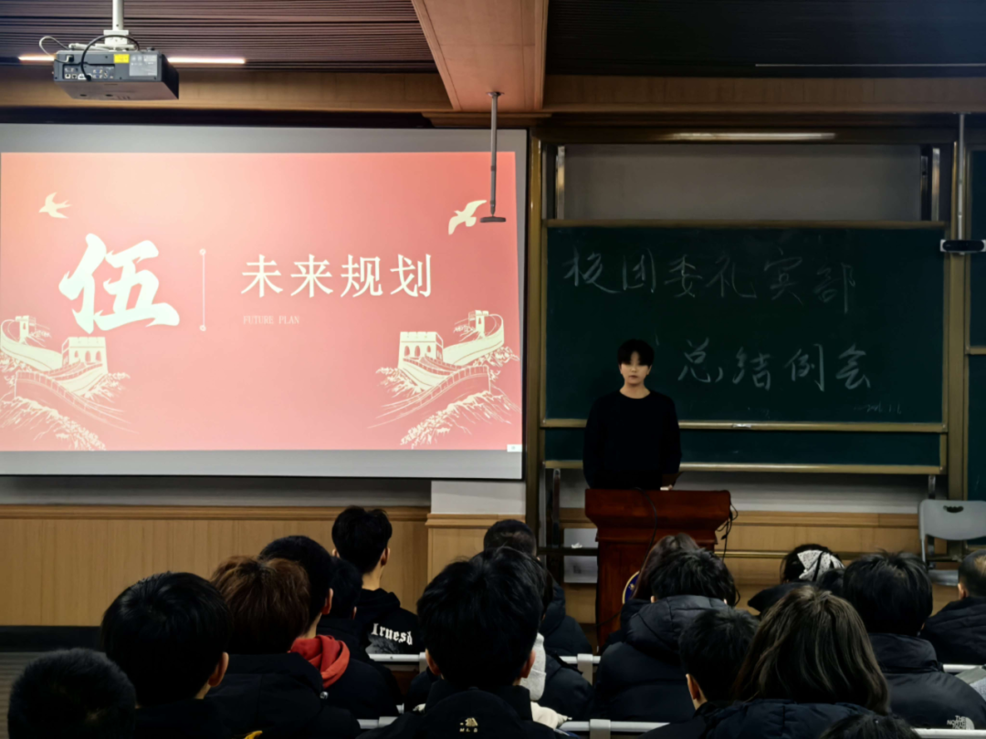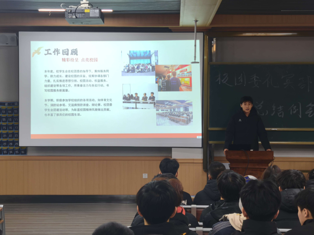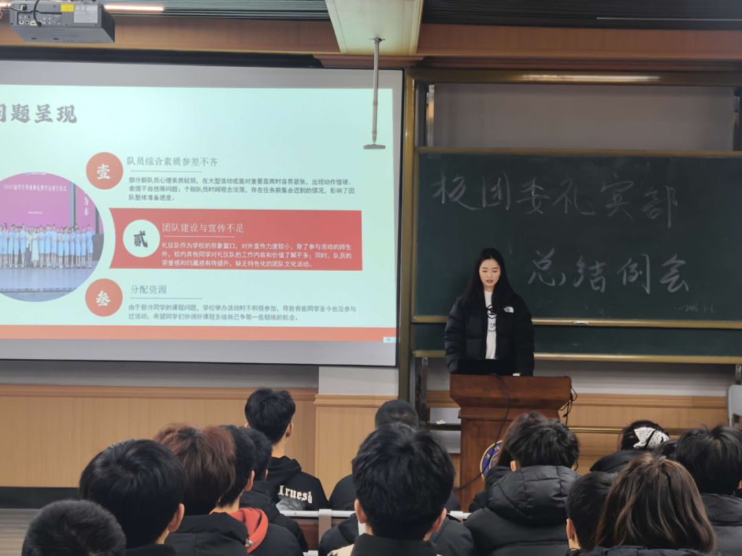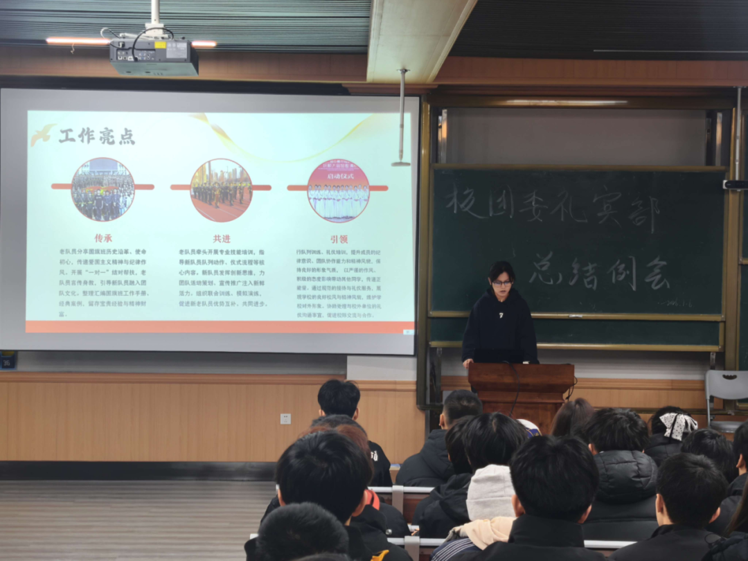 副部长徐一源全面总结了本学期工作。他指出,本学期礼宾部始终围绕“服务同学、助力成长”的宗旨,扎实推进迎新服务、升旗训练及队伍招新等基础工作,着力加强队列纪律与训练质量管理。同时,部门积极配合参与校团委组织的多项校园活动,在服务过程中深化思想引领,完善组织建设,不仅丰富了校园文化氛围,也进一步增强了部门内部的凝聚力与综合能力。